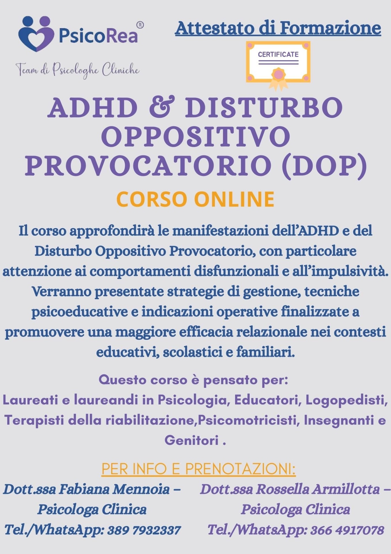 "ADHD e Disturbo Oppositivo Provocatorio (DOP): comprensione, osservazione e tecniche di gestione" Con rilascio di attestato di formazione valido ai fini curriculari